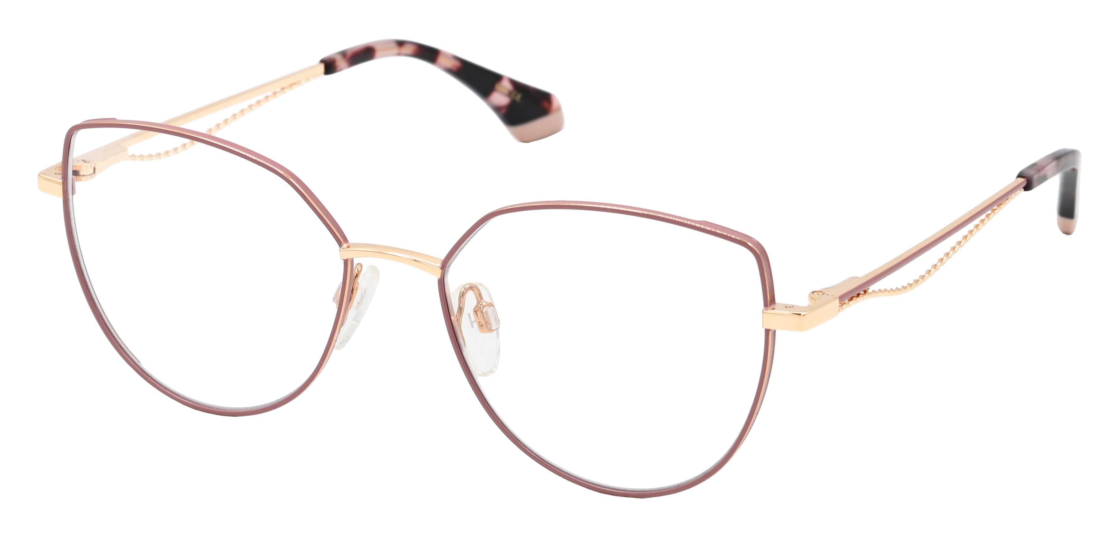 Тонкая металлическая оправа золотистого цвета отличается оригинальной формой – это гармоничная легкая «бабочка» со скошенными верхними внутренними уголками и еле уловимым акцентом на внешних верхних уголках. Внешняя и торцевая стороны рамки прокрашены в нежный розово-сиреневый цвет.